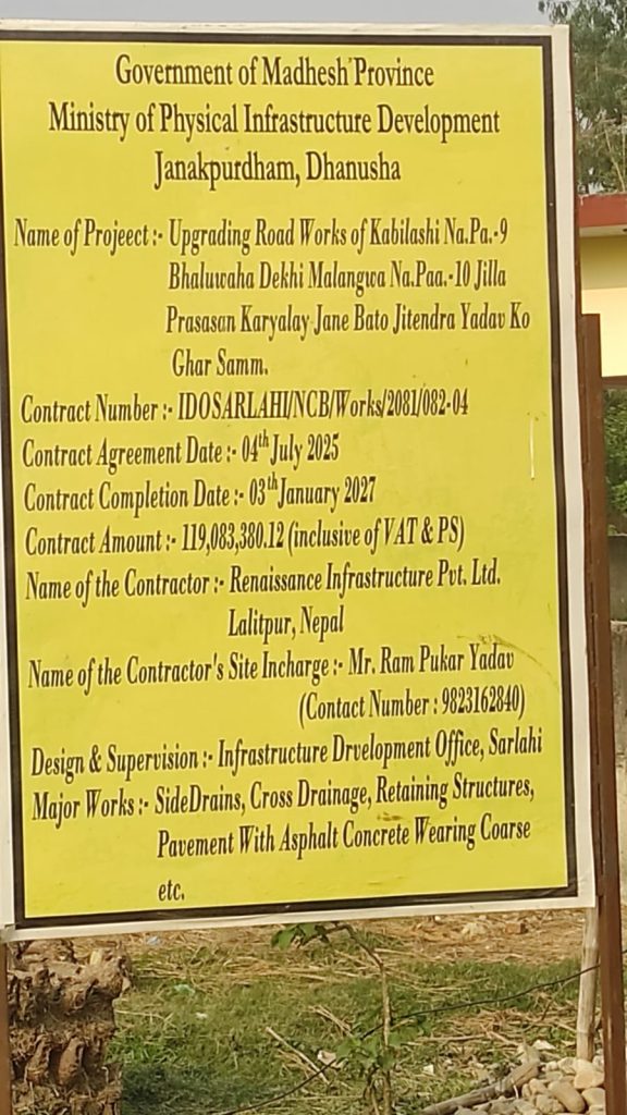 सर्लाही, मलंगवा। सर्लाहीको कविलासी नगरपालिका–९ भलुवाहा टोलदेखि मलंगवा नगरपालिका–१० स्थित जिल्ला प्रशासन कार्यालयसम्म जाने सडक निर्माण कार्यमा अनियमितता भएको भन्दै स्थानीयवासीले गम्भीर गुनासो गरेका छन्।