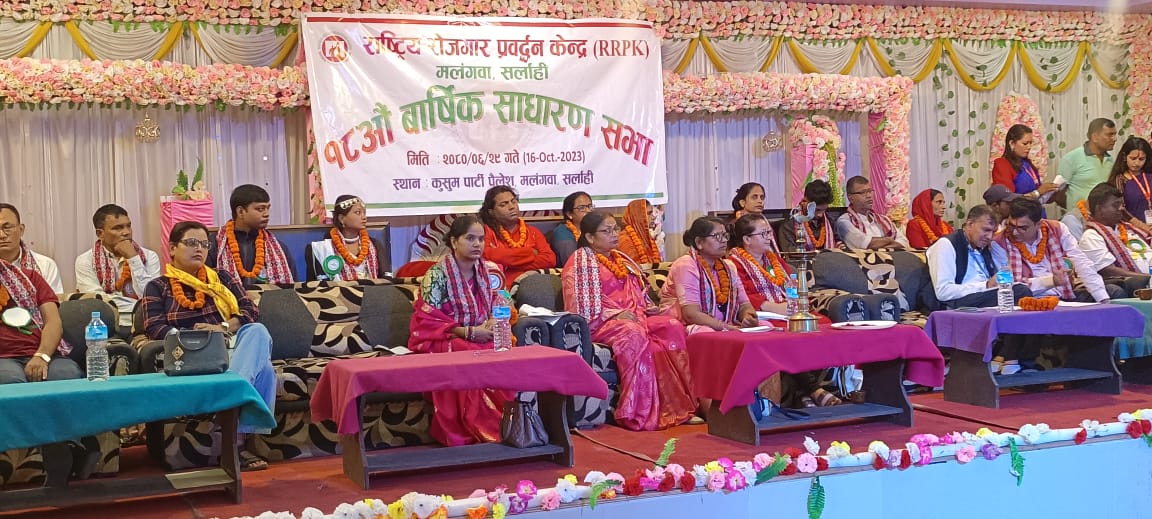 सर्लाहीको सदरमुकाम मलंगवा नगरपालिका ८ स्थित रहेको कुसुम पार्टी प्यालेसमा राष्ट्रिय रोजगार प्रबर्द्धन केन्द्र (च्च्एप्) को १८ औ वार्षिक साधारणसभा सम्पन्न भएको छ । साधारणसभामा गत आर्थिक वर्ष २०७९/०८० को आर्थिक प्रतिवेदन प्रस्तुत गरिएको छ । केन्द्रकी कोषाध्यक्ष पिंकी साहले दातृ संस्थाहरु सेभ द चिल्ड्रेन ,वर्ल्ड भिजन इन्टरनेसनल नेपाल ,वर्ल्ड एजुकेसन ,ह्यान्डिक्याप इन्टरनेसनल ,सेसी सम्बन्धित स्थानीय तहको सहयोगमा संचालन भएका विभिन्न परियोजनाहरुको बारेमा जानकारी गराउनुका साथै संस्थाको वार्षिक आर्थिक प्रतिवेदन प्रस्तुत गरेकी थिइन ।